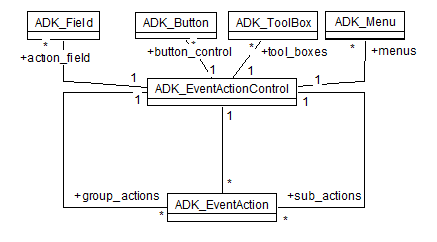 Event actions may get a number of group or sub actions (ADK_EventAction). Group actions are, typically, displayed as group (in a menu or tool bar). Sub actions are displayed in a sub-menu of the menu or tool bar. Each event action may define the action to be executed completely or refer to an event action control, which defines the event action to be executed.