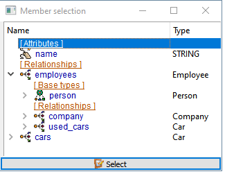 A selection three pops up showing the class members of the defined data type, or for fields for the data type evaluated for the parent field/query.