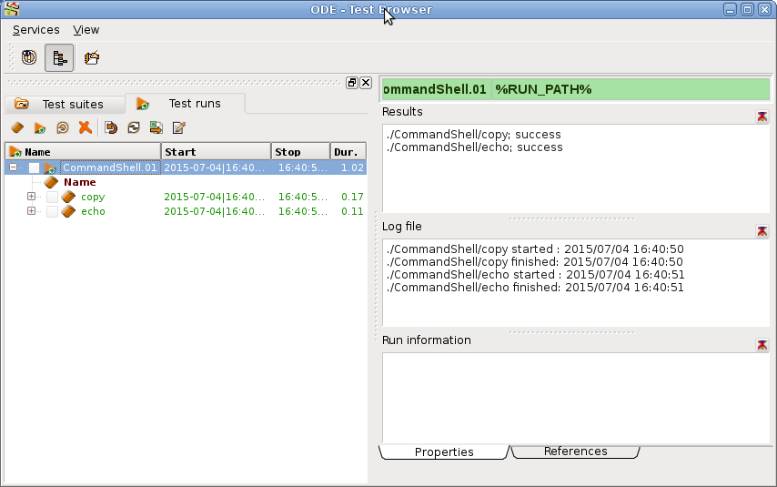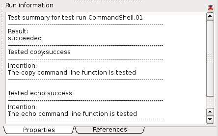 After running the test, tests successfully executed are displayed with green color. Tests failed become red. On the right side test results are listed for all executed tests and start/stop statistics are shown in the log file box as well as in the tree. Log file statistics are created by the command shell test framework while tree statistics are created by TestBrowser.