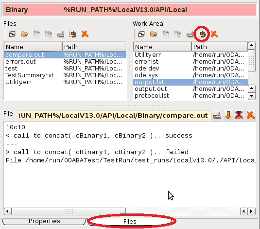 The Files view shows two file lists. Files shows the files stored in the run entry directory. The work area file list shows the files from last test (input and output files). The list will be refreshed when running the next test. When selecting a file entry in one of the lists, the file content is displayed in the file edit area below the lists.