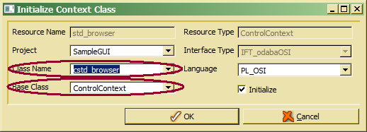 A default class name has bee created from the resource name prefixed by the option set in Options.Implementation.Naming.ControlContextClassPrefix. One may change the name or assign an existing context class from the drop list. The default base class is the system context class defined for the resource type (typically ControlContext), but an alternative context class might be selected from the drop list.