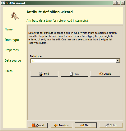 In order to choose the data type for the attribute, one of the elementary data types might be selected from the types displayed in the drop list. For selecting a complex (user-defined) data type, one may enter the type name directly in the Data type field or use enhanced find by pressing the Find button, which allows selecting a data type defined in the project or a system data type. When the data type entered does not yet exist, one may enter the new data type name in the field and press the New button. In this case, a sub wizard for defining new data type pops up (Data Type Wizard), which is described in chapter "Data Type Wizard". For viewing the type definition for the selected type, the Details button might be used.