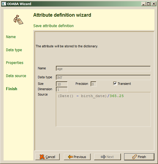 The data source definition step is shown only, when the attribute has been defined as transient attribute. There are, typically, two ways of computing values for transient attributes. One is the doAfterRead() handler for the data type. The other is defining a data source expression using OSI. When defining a data source via expression, the attribute value will be evaluated only, when accessing the attribute, which is more efficient than calculating the value in a read handler.