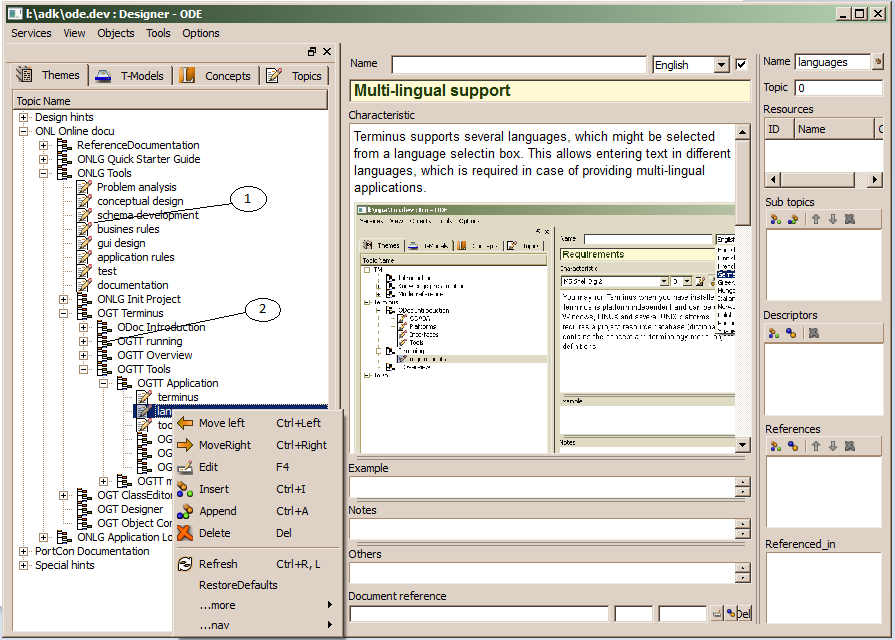 Hierarchy topics have got unique names, which allow inserting or appending existing hierarchy topics at any position within the list. Each hierarchy topic is linked with a topic definition that contains the content of the topic. The topic linked to the hierarchy topic is displayed in the drop list on the top of the right panel. By selecting another named topic from the list one may easily link another topic definition to the hierarchy topic.
