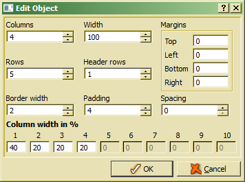 The action displays table layout properties for the table in which the cursor is positioned. When cursor is not positioned within a table cell, nothing will happen. Otherwise, a table layout dialog pops up: