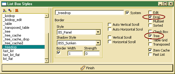When defining an own drop list style,the Drop option has to be switched on. The appearance of the list depends on the Tree option in the style definition.
