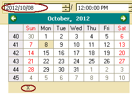 Date components may be updated directly within the spin box field, but also by using the calendar, which pops up when clicking the right mouse button on the control. In order to erase the date value, one may click on the clear symbol (X) on bottom of the calendar.