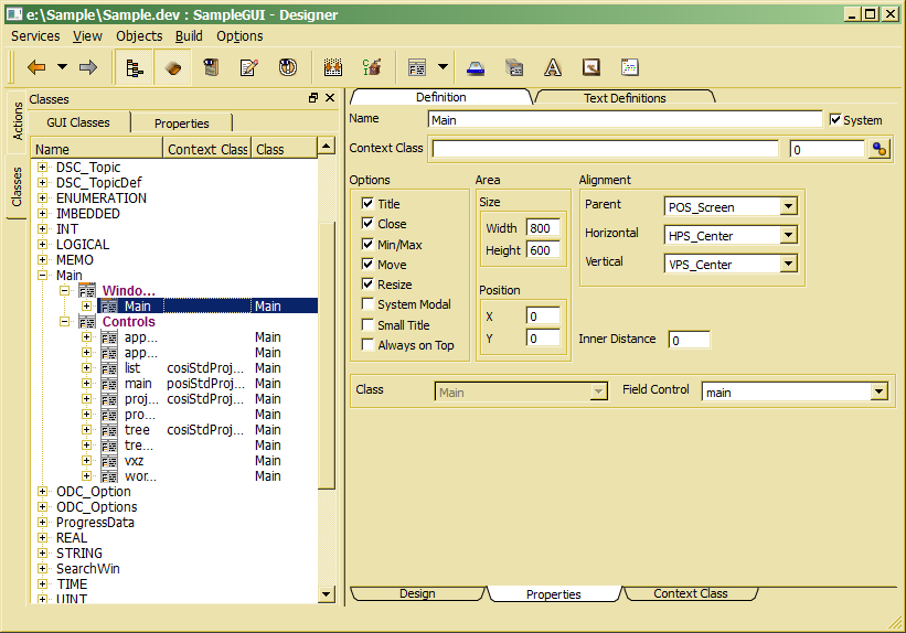 A window or dialog provides a (usually) movable frame for a control. While the control referenced in the window definition defines the dialog content, the dialog itself defines the the frame and its behavior. Window properties are accessible when selecting the window in the class list and choosing the property view (Property tab bottom of the workspace).