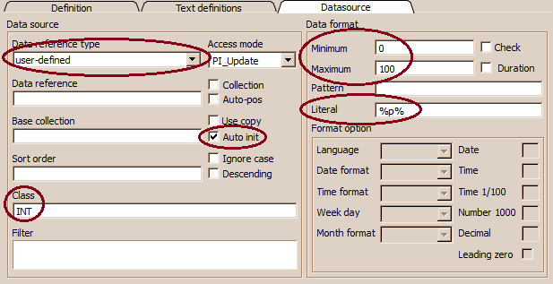 The data source in the field definition (ADK_Field) for a progress bar is defined as user-defined data source of type ProgressData (auto_initialize=true) or as integer field, when referring to fixed minimum and maximum value (see fixed and variable progress bar below).