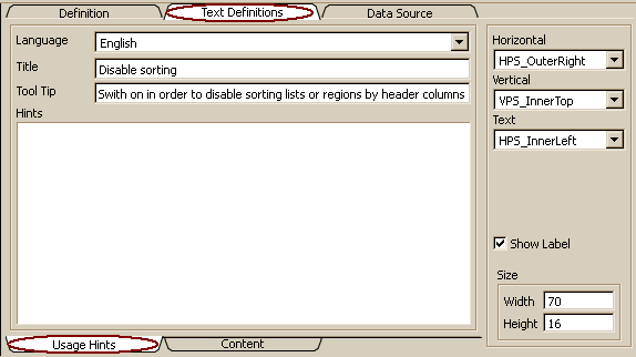 In order to edit usage hints, the Text tab on bottom of the Text Definitions form has to be activated, which is provided in all GUI resource forms that require or support text definitions. Some GUI resources, which do not support content or concept definitions, do show usage hints, only (and no bottom tabs for changing the description type).