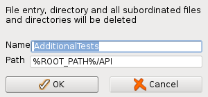 The action deletes all selected test environment directories (check box activated in the test suite tree) and all its subordinated directories and files in the database as well as in the file system. When no check box is activated in the list, the currently selected entry is deleted, i.e. in order to delete a single test environment directory, the corresponding line has to be selected, only, before clicking the button. By default, deletion happens immediately without warning.