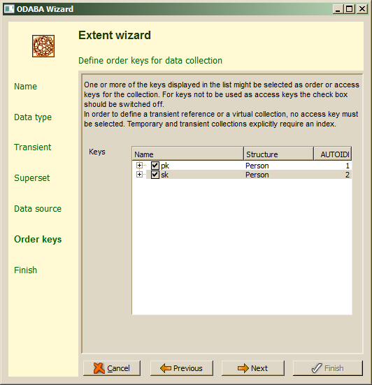 For temporary or transient collections, a data source should be defined for filling the collection. Temporary or transient collections with a data source definition are filled only, when being accessed. When not defining a source expression, the extent has to be created when being opened (typically in the doAfterOpen() handler for the extent property class). The Next step allows selecting one or more access keys (order keys).