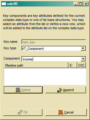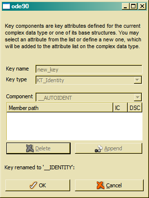 Clicking the Append button will add the attribute to the key component list. When defining a key component that does not yet exist as attribute, an attribute with the key component name will be created for the selected data type. By default, the data type for the new attribute is CHAR, which might be changed later editing the attribute in the attribute list.