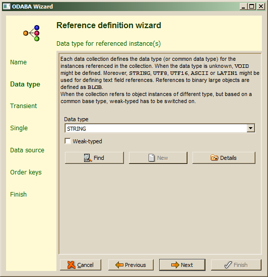 The data type is initialized to STRING, which defines a memo field with local character encoding type. In order to store for different languages, UTF8 or UTF16 are suggested. For creating a reference to a binary large object, BLOB might be entered. Large text fields or blobs should never be defined as weak-typed, i.e. the Weak-typed option should be off.