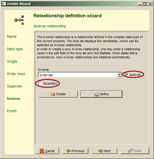 The inverse relationship becomes member of the relationship type. When auto init is switched on (default), the member properties for the inverse are generated properly, i.e. one only need to enter a name for the inverse relationship (or select a candidate from the drop list) and click Next to continue. In order not to create the inverse relationship automatically, the auto init option should be switched off (not suggested). For defining and browse the new relationship explicitly, the Define button might be pressed, which allows e.g. correcting the cardinality (dimension), which is initialized wit 0 (undefined) but should be set to 1, when only parent instance can be referenced in only in related object instance.