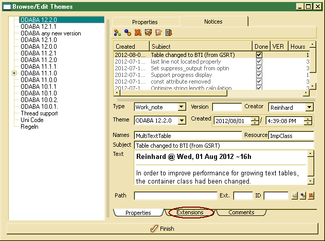 Themes provide a hierarchical object tree and may represent projects, project releases, activities, milestones or anything else. The notice state helps checking, whether there are still tasks for a theme or not. Open tasks may be solved or postponed to the next milestone (theme) by assigning a new mile stone to the notice (theme).