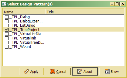 In order to initialize the main application window, one should select _TPL_TreeProject from the pattern list, which initializes an application with a main tree on the left side and a dynamic work area on the right side. In order to select the right pattern, one may select a pattern and click the Show button, which displays the current pattern design. More information about how to use the pattern one may get when clicking the About button.