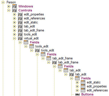 Each tab_edit controls contains a static area (e.g. Person::edit_static), which will be displayed on each tab level. The first tab page shows the object's properties (Person::edit_properties) and the second tab shows references (Person::edit_references). In order to make data visible, those three controls should be designed or removed. The tools_edit control also defines a window toolbar, which might be updated or removed. Some additional ...frame controls have been added, which are necessary for technical reasons.