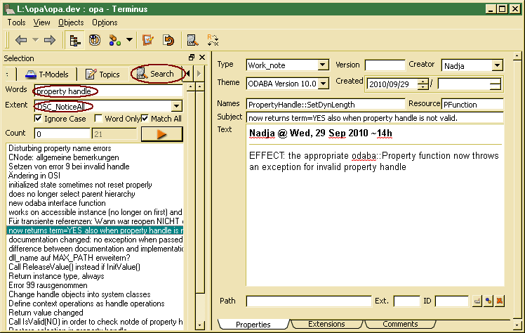 Full text search for notices is provided with the Terminus (ODE tool). By selecting the Search-tab, entering one or more search words and selecting the proper extent/collection (DSC_Notice for active notices or DSC_NoticeAll for all), a full text search will be performed for all notices in the selected collection.