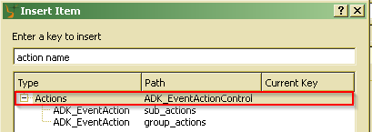 For creating an event action control, the action name has to be defined and the ADK_EventActionControl line has to be selected in the hierarchy level tree above. In order to create sub or group actions for the selected event action control, one may select the sub_actions or group_actions line (more details see in Elements definition below).